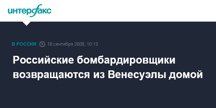 Москва. 18 сентября. INTERFAX.RU - Два стратегических бомбардировщика Ту-160 в 10:00 мск вылетели из Каракаса в Россию, сообщил "Интерфаксу-АВН" помощник главкома ВВС России подполковник Владимир Дрик.