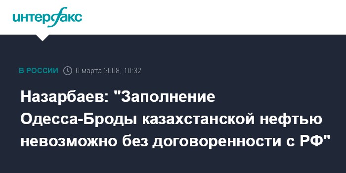 Киев. 6 марта. INTERFAX.RU - Решение вопроса о заполнении нефтепровода Одесса-Броды казахстанской нефтью невозможно без договоренности с российской стороной, заявил президент Казахстана Нурсултан Назарбаев.