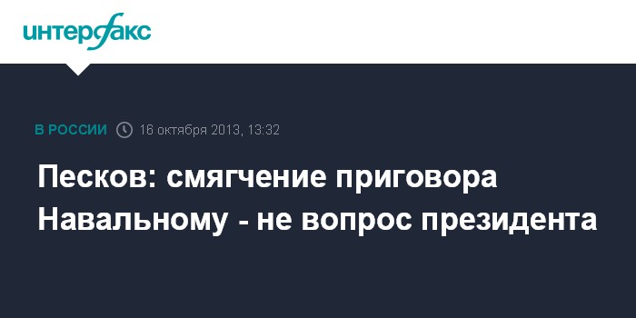 Москва. 16 октября. INTERFAX.RU - Пресс-секретарь президента РФ Дмитрий Песков не считает, что позиция главы государства могла повлиять на смягчение приговора оппозиционеру Алексею Навальному.