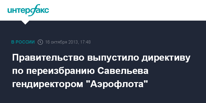Москва. 16 октября. INTERFAX.RU - Правительство России направило директиву членам совета директоров ОАО "Аэрофлот - российские авиалинии" о переизбрании Виталия Савельева генеральным директором компании сроком на 5 лет.