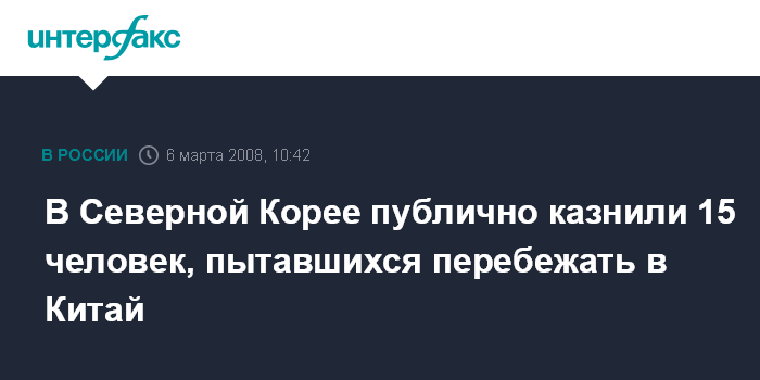 Лондон. 6 марта. INTERFAX.RU - В пограничном с КНР северокорейском городе Онсон были публично казнены 13 женщин и двое мужчин за то, что они пытались перебежать в Китай или содействовали таким попыткам, сообщает в четверг британская телерадиокомпания Би-Би-Си.
