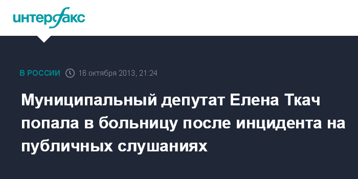 Москва. 16 октября. INTERFAX.RU - Муниципальный депутат Пресненского района Москвы Елена Ткач госпитализирована с сотрясением мозга после инцидента, который произошел на публичных слушаниях, сообщил ее муж, координатор Общественной коалиции в защиту Москвы Роман Ткач.