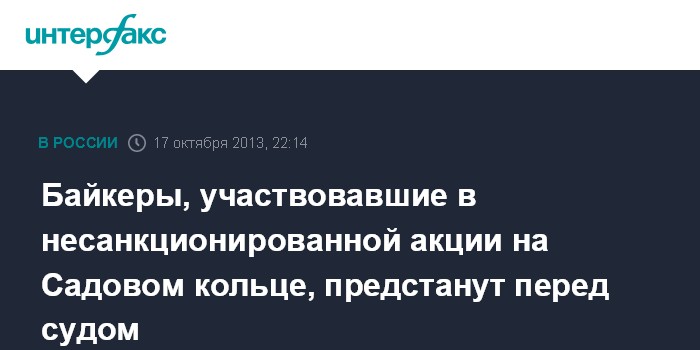 Москва. 17 октября. INTERFAX.RU - Участников несанкционированной акции байкеров на Зубовском бульваре Москвы привлекут к суду за нарушение ПДД и правил проведения публичных акций, сообщили "Интерфаксу" в четверг в пресс-службе столичного ГУ МВД. "На всех граждан, задержанных сегодня на Зубовском бульваре за нарушение правопорядка, составлены административные материалы", - сказал представитель главка.