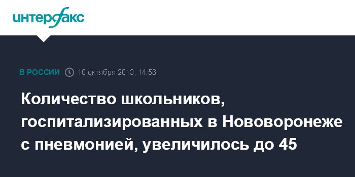 Воронеж. 18 октября. INTERFAX.RU - Количество госпитализированных с пневмонией школьников в Нововоронеже Воронежской области выросло до 45 человек.