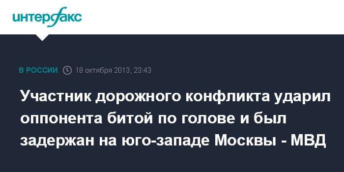 Москва. 18 октября. INTERFAX.RU - Полицейские задержали участника дорожного конфликта, ударившего оппонента бейсбольной битой, на юго-западе столицы, сообщили "Интерфаксу" в пресс-службе ГУ МВД России по Москве.
