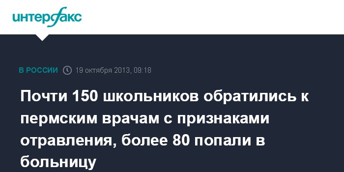Москва. 19 октября. INTERFAX.RU - Число пермских школьников, госпитализированных с отравлением, увеличилось до 84 человек, сообщили "Интерфаксу" в пресс-центре МВД России.