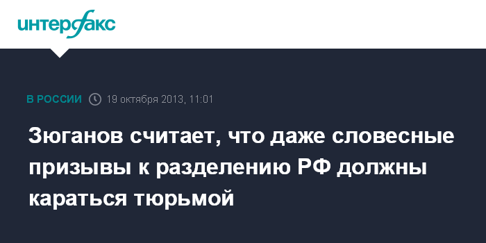 Москва. 19 октября. INTERFAX.RU - Лидер КПРФ Геннадий Зюганов призывает ввести уголовное наказание за призывы к разделению России. "Мы - наши депутаты - должны внести предложение: что даже словесные призывы к разделению единой и неделимой России будут караться тюремным заключением", - сказал Г.Зюганов на пленуме ЦК КПРФ в городе Московский в субботу.