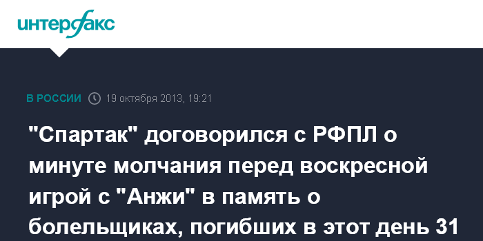 Москва. 19 октября. INTERFAX.RU - Минута молчания в память о 66-ти болельщиках, которые погибли 20 октября 1982 года в Москве в "Лужниках", будет объявлена на стадионе в Каспийске в воскресенье перед началом матча 13-го тура чемпионата России по футболу между махачкалинским "Анжи" и московским "Спартаком", сообщил генеральный директор "Спартака" Роман Асхабадзе.
