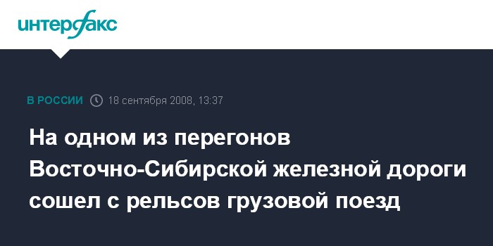 Москва. 18 сентября. INTERFAX.RU - Движение на перегоне "Подкаменная-Глубокая" Восточно-Сибирской железной дороги остановлено из-за схода с рельсов нескольких вагонов грузового поезда со стальными заготовками, сообщил департамент корпоративных коммуникаций ОАО "Российские железные дороги".