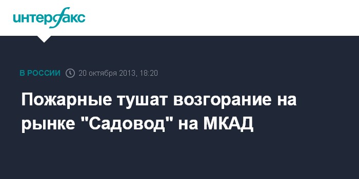 Москва. 20 октября. INTERFAX.RU - На юго-востоке Москвы возник пожар на рынке "Садовод", сообщили "Интерфаксу" в пресс-службе ГУ МЧС России по Москве. "По предварительным данным, площадь возгорания на рынке, расположенном на 14-м километре МКАД, составляет 50 квадратных метров", - заявил сотрудник пресс-службы. Он отметил, что пожарные приступили к тушению. Сведений о пострадавших не поступало.