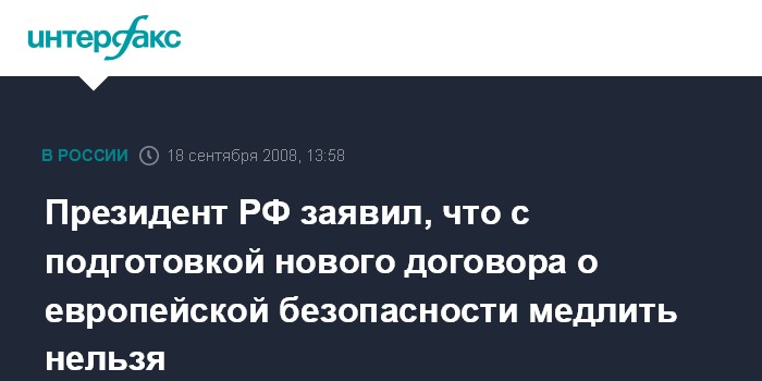 Москва. 18 сентября. INTERFAX.RU - Россия предлагает ускорить разработку и принятие нового договора о европейской безопасности. "Несколько месяцев назад мною была выдвинута идея подготовки большого договора о европейской безопасности", - заявил президент РФ Дмитрий Медведев.