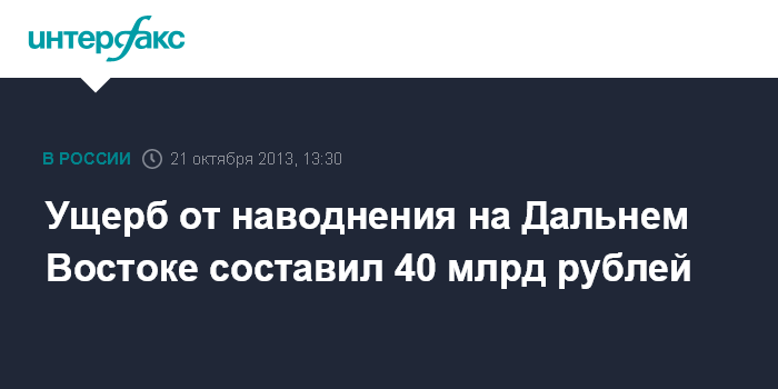 Санкт-Петербург. 21 октября. INTERFAX.RU - Министерство регионального развития РФ оценивает общий размер ущерба от паводка на Дальнем Востоке примерно в 40 млрд рублей.