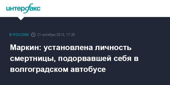 Москва. 21 октября. INTERFAX.RU - Взрыв в автобусе в Волгограде произошел сразу после того, как в него вошла уроженка Дагестана Наида Ахиялова, сообщил "Интерфаксу" официальный представитель СК РФ Владимир Маркин.