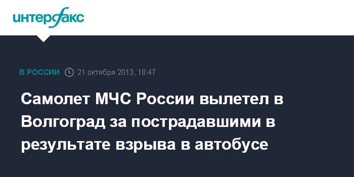 Москва. 21 октября. INTERFAX.RU - МЧС России в понедельник вечером направило самолет в Волгоград для эвакуации на лечение в клиники Москвы тяжело пострадавших в результате взрыва в городском автобусе, сообщила официальный представитель МЧС России Ирина Россиус.