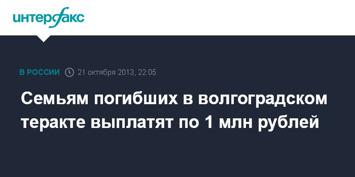 Москва. 21 октября. INTERFAX.RU - Семьи погибших при взрыве автобуса в Волгограде получат из регионального бюджета по 1 млн рублей.