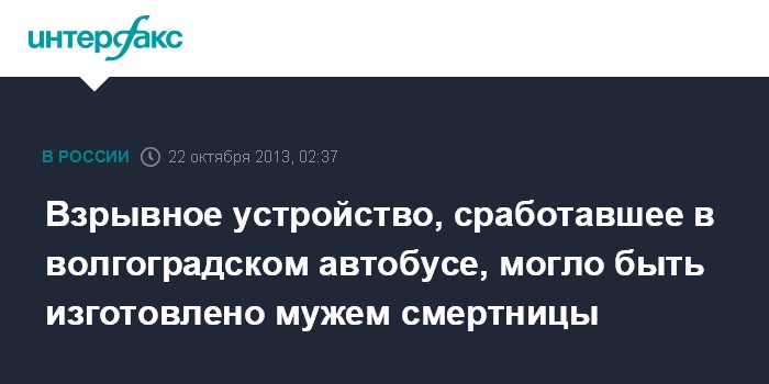 Ростов-на-Дону. 22 октября. ИНТЕРФАКС-ЮГ - Самодельное взрывное устройство, которое привела в действие террористка-смертница в волгоградском автобусе в минувший понедельник, могло быть изготовлено ее мужем-боевиком, находящимся в федеральном розыске, сообщили агентству "Интерфакс-Юг" в правоохранительных органах.