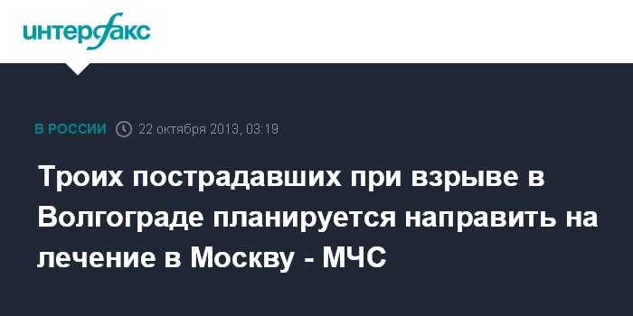 Москва. 22 октября. ИНТЕРФАКС - Троих пострадавших при взрыве в автобусе в Волгограде планируется отправить на лечение в Москву самолетом МЧС, сообщила официальный представитель МЧС России Ирина Россиус.