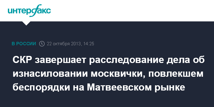 Москва. 22 октября. INTERFAX.RU - Следователи в Москве завершают расследование уголовного дела об изнасиловании москвички, повлекшем массовую драку торговцев Матвеевского рынка с полицейскими в ходе задержания подозреваемого, сообщил официальный представитель СКР Владимир Маркин.