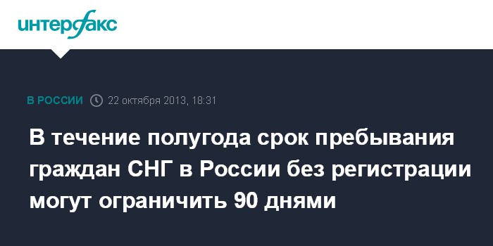 Уфа. 22 октября. INTERFAX.RU - Глава Федеральной миграционной службы (ФМС) РФ Константин Ромодановский предлагает ограничить срок пребывания граждан СНГ в РФ без регистрации 90 днями в течение полугода.