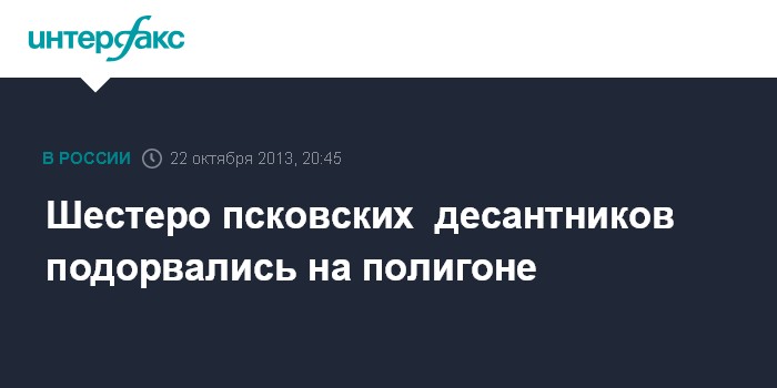 "22 октября на 714 полигоне, близ населенного пункта Струги Красные (Псковская область) при возвращении военнослужащих в ВДВ с конечного рубежа зачетной стрельбы в условиях полной темноты произошел подрыв неизвестного взрывного устройства. В результате взрыва погибли шесть военнослужащих ВДВ, еще двое военнослужащих получили ранения. Они доставлены в ближайшее медучреждение", - уточнил собеседник агентства.
