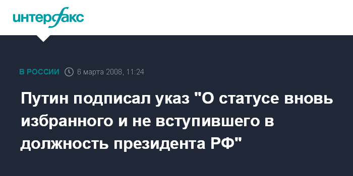 Москва. 6 марта. INTERFAX.RU - Президент РФ Владимир Путин подписал указ, которым поручил президентской администрации "обеспечивать деятельность вновь избранного и не вступившего в должность президента РФ".