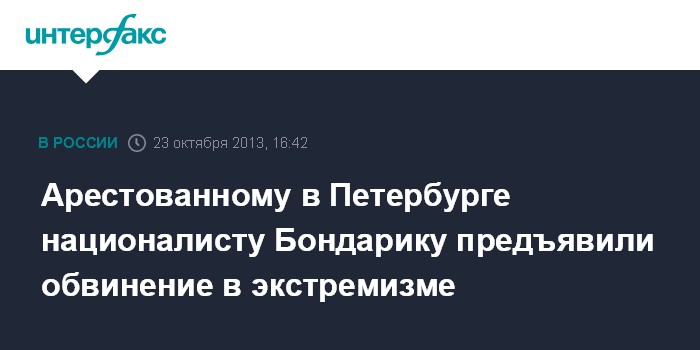 Санкт-Петербург. 23 октября. INTERFAX.RU - Арестованному председателю общественного движения "Русская партия" Николаю Бондарику предъявлено обвинение в совершении преступления экстремистской направленности, сообщили "Интерфаксу" в ГСУ СКР по Петербургу.