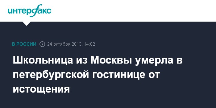 Как сообщила пресс-служба ведомства в четверг, вечером 23 октября 2013 г. в одном из номеров гостиницы, расположенной на Гончарной улице Санкт-Петербурга, было обнаружено тело 15-летней уроженки города Москвы без видимых признаков насильственной смерти, в состоянии сильного истощения организма.