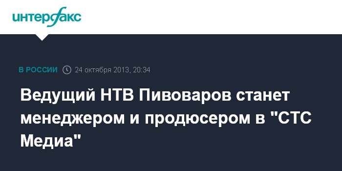 Москва. 24 октября. INTERFAX.RU - Тележурналист и ведущий телеканала НТВ Алексей Пивоваров переходит в холдинг "СТС Медиа", где займет пост директора по направлению ТВ и трансмедиапроектов. Как сообщается на сайте телеканала НТВ, Пивоваров принял решение развиваться как телевизионный продюсер и для этого перешел в холдинг "СТС Медиа".