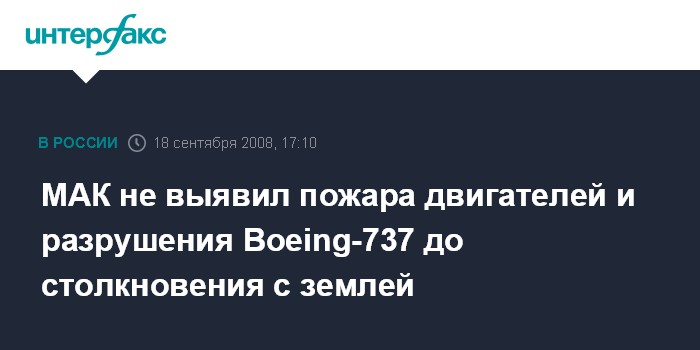 Москва. 18 сентября. INTERFAX.RU - Техническая комиссия Межгосударственного авиационного комитета (МАК) не выявила пожара двигателей и разрушения самолета Boeing-737, потерпевшего крушение в Перми, до столкновения с землей, говорится в официальном заявлении МАК.