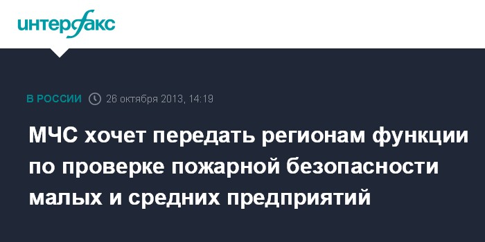 "Правительством РФ рассматриваются предложения МЧС России по изменению законодательства о защите прав юридических лиц и индивидуальных предпринимателей, предусматривающие наделение федеральных органов исполнительной власти правами по категорированию объектов защиты с целью определения порядка и периодичности их проверок. Его принятие позволит полностью вывести субъекты малого и среднего бизнеса из-под надзора со стороны МЧС по вопросам пожарной безопасности", - сообщила журналистам официальный представитель МЧС России Ирина Россиус.