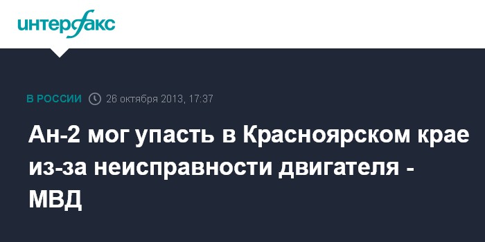 Красноярск. 26 октября. INTERFAX.RU - Возможной причиной падения Ан-2 в районе поселка Таежный (Красноярский край) могла стала неисправность двигателя самолета, сообщила агентству "Интерфакс-Сибирь" начальник пресс-службы ГУ МВД России по краю Ирина Мужецкая. "Из-за неисправности двигателя самолет начал искать место посадки, но упал около одного километра от поселка Таежный" - рассказала И.Мужецкая.