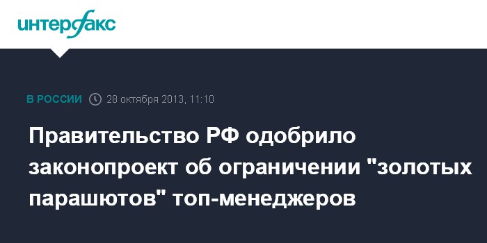 Москва. 28 октября. INTERFAX.RU - Правительство РФ одобрило предложение ограничить "золотые парашюты" топ-менеджеров госкомпаний их средним шестимесячным заработком.