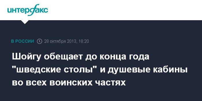 Москва. 28 октября. INTERFAX.RU - Министр обороны РФ Сергей Шойгу сообщил, что к концу года во всех частях Вооруженных сил будут организованы "шведские столы" и введены душевые кабины.