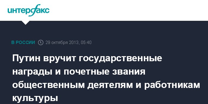Путин вручит государственные награды и почетные звания общественным деятелям и работникам культуры