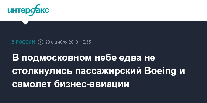 Москва. 29 октября. INTERFAX.RU - Пассажирский Boeing, летевший из Москвы в Архангельск, при наборе высоты чуть не столкнулся с самолетом бизнес-авиации, направлявшимся из Санкт-Петербурга в "Домодедово", сообщил во вторник "Интерфаксу" источник в авиадиспетчерских службах московского авиаузла.
