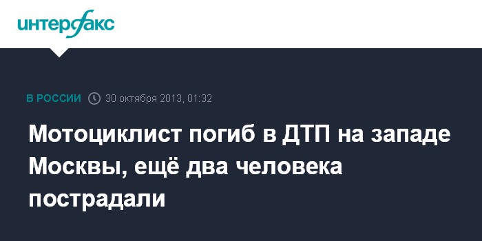 Москва. 30 октября. INTERFAX.RU - В результате аварии, произошедшей на западе Москвы вечером во вторник, погиб мотоциклист, два человека пострадали, сообщили "Интерфаксу" в ночь на среду в пресс-службе столичной Госавтоинспекции.