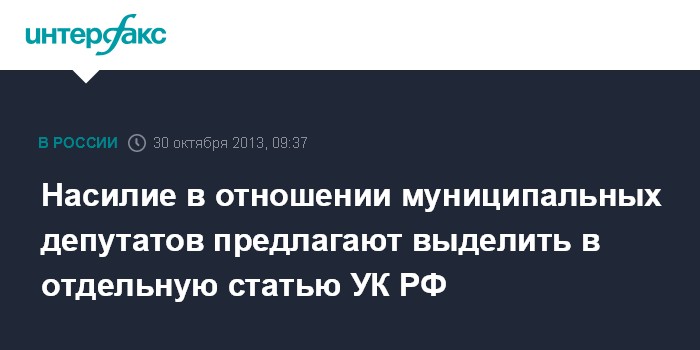 "Проект документа предполагает внесение в УК РФ новой статьи - 318.1 - "Применение насилия в отношении представителя местного самоуправления (депутата муниципального собрания)". Поправки предполагают, что за применение насилия, не опасного для жизни и здоровья, будет грозить наказание в виде срока до 5 лет колонии либо в виде принудительных работ на тот же срок или штраф до 200 тыс. руб., а также арест до полугода", - пишет издание.