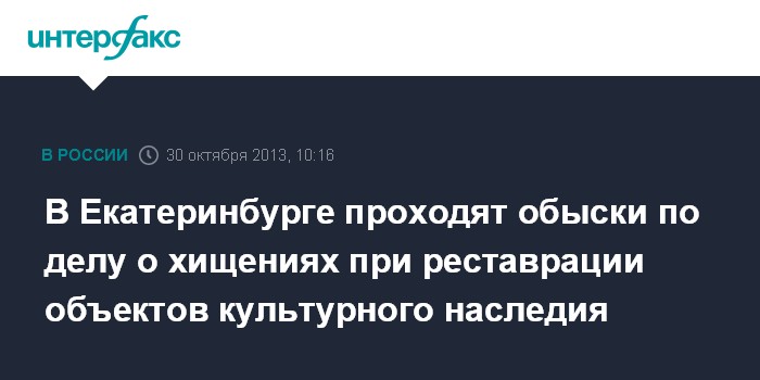 Екатеринбург. 30 октября. INTERFAX.RU - В рамках расследования уголовного дела о хищении бюджетных средств, выделенных на реставрацию объектов культурного наследия, сотрудники ГУ МВД РФ по УрФО в среду проводят ряд обысков в Екатеринбурге, сообщает пресс-служба окружного полицейского главка.