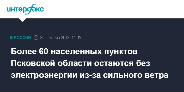 Псков. 30 октября. INTERFAX.RU - По состоянию на 08.00 мск на территории Псковской области из-за шторма "Святой Иуда" без электроэнергии остаются 63 населенных пунктах в пяти районах, сообщает пресс-служба регионального ГУ МЧС.