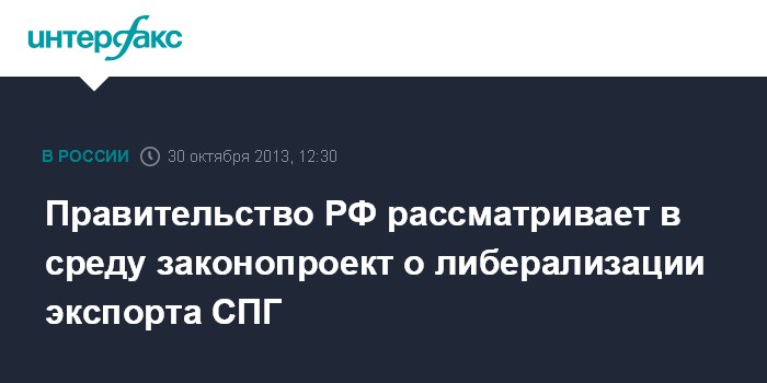 Москва. 30 октября. INTERFAX.RU - Правительство РФ на заседании в среду рассмотрит законопроект о либерализации экспорта сжиженного природного газа (СПГ), сообщил премьер-министр РФ Дмитрий Медведев, открывая заседание правительства.