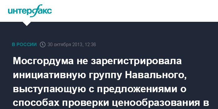 Москва. 30 октября. INTERFAX.RU - Инициативная группа во главе с Алексеем Навальным, внесшая проект закона о применении отдельных способов проверки обоснованности установления, изменения или применения цен, тарифов на жилищно-коммунальные услуги, не будет зарегистрирована, постановила в среду Мосгордума.