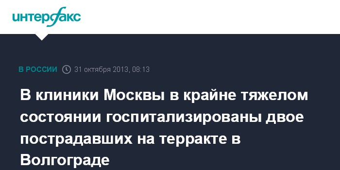 В клиники Москвы в крайне тяжелом состоянии госпитализированы двое пострадавших на терракте в Волгограде