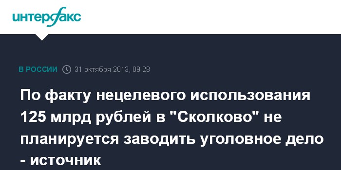 По факту нецелевого использования 125 млрд рублей в "Сколково" не планируется заводить уголовное дело - источник