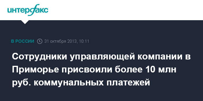 Владивосток. 31 октября. INTERFAX.RU - Полиция подозревает сотрудников управляющей компании в приморском городе Уссурийске в нецелевом использовании более чем 10 млн рублей, полученных от жильцов.