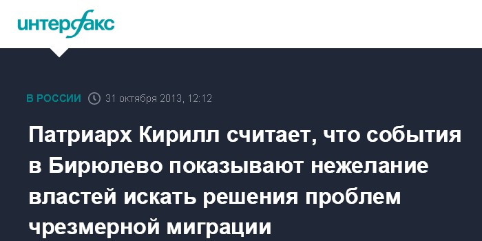 "Столкновения, которые произошли недавно в московском микрорайоне Бирюлево, показывают: глухота власть имущих к требованиям народа, нежелание искать совместные решения проблем чрезмерной миграции и связанного с ней криминала, а также подчас вызывающего поведения приезжих уже сейчас выводят ситуацию на грань критической черты", - сказал патриарх на открытии XVII Всемирного русского народного собора.
