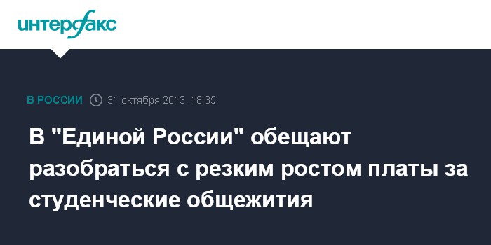 Москва. 31 октября. INTERFAX.RU - В "Единой России" обещали помочь студентам с проблемой, связанной с резким повышением платы за студенческие общежития, которая с 1 сентября устанавливается вузами.