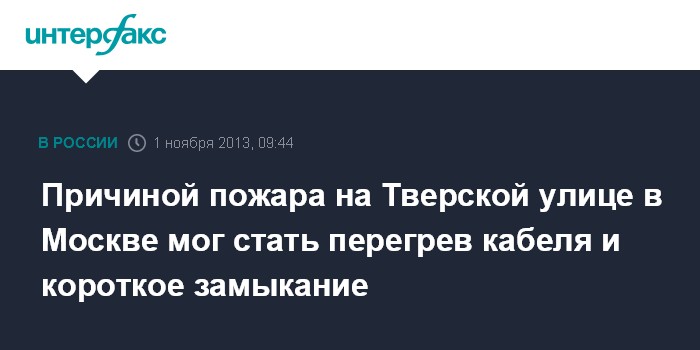 Москва. 1 ноября. INTERFAX.RU - По предварительной версии, причиной пожара в подвале дома 15 по Тверской улице вечером в четверг стал перегрев кабеля и, как следствие, короткое замыкание в электросети, сообщил "Интерфаксу" источник в правоохранительных органах столицы.