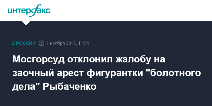 Москва. 1 ноября. INTERFAX.RU - Мосгорсуд признал в пятницу законным заочный арест фигурантки дела о массовых беспорядках на Болотной площади Анастасии Рыбаченко, которая после событий 6 мая 2012 г. уехала жить в Эстонию.