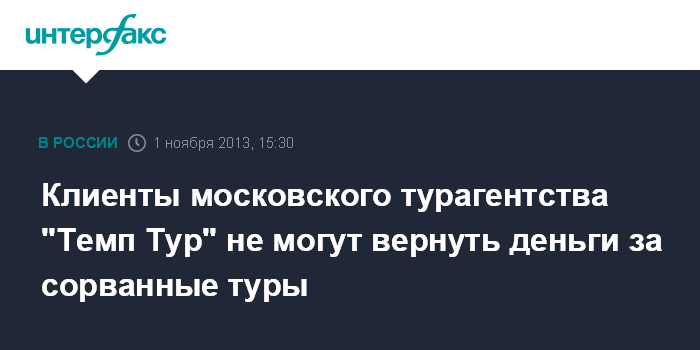 Москва. 1 ноября. INTERFAX.RU - Московское турагентство "Темп Тур" сорвало оплаченные туры своим клиентам, которые до сих пор не могут получить свои денежные средства в полном объеме.