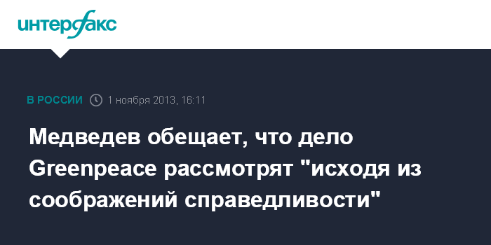 Москва. 1 ноября. INTERFAX.RU - Премьер-министр РФ Дмитрий Медведев заверил своего французского коллегу, что дело активистов движения "Гринпис" будет рассмотрено справедливо, в строгом соответствии с российским законодательством.